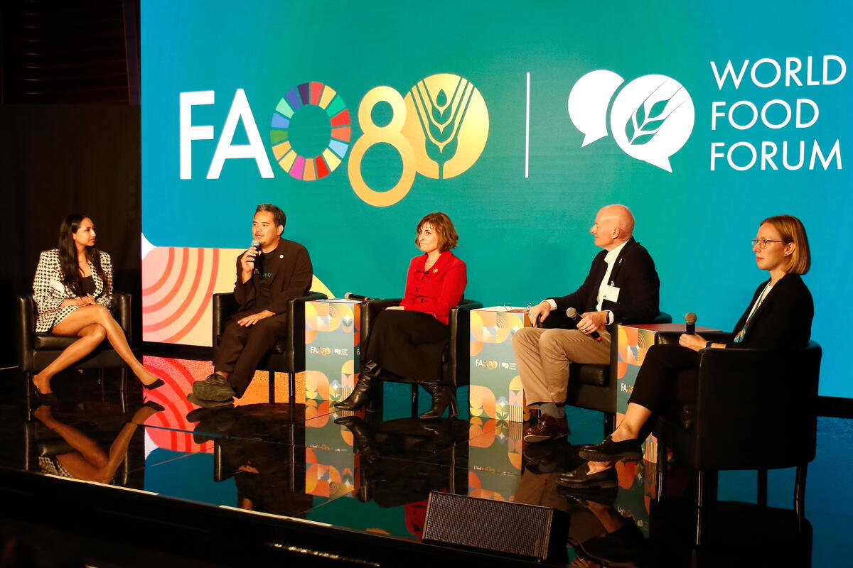 15 October 2025, FAO Rome Headquarters, Italy. Emily Norford (2-R), Ian Roberts (R), Beth Bechdol (C), FAO Deputy Director-General, Kunihiro Shimoji (L) and Miraal Kabir (2-L) attend the Private Sector Roundtable at WFF 2025.