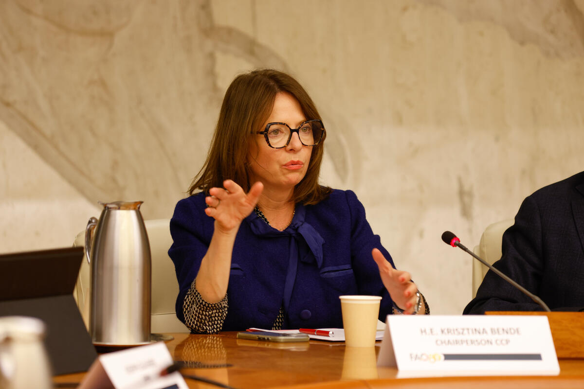 15 October, 2025. FAO Headquarters, Rome, Italy. H.E. Krisztina Bende, Ambassador and Permanent Representative of Switzerland to the UN Organisations in Rome, speaks at the 'Intersessional Event of the FAO Committee on Commodity Problems: Better information for better policies' event during the 2025 World Food Forum.