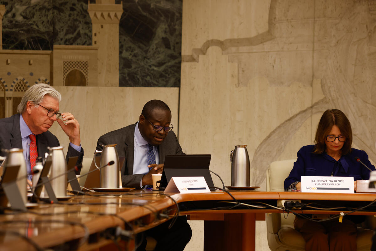 15 October, 2025. FAO Headquarters, Rome, Italy. Roundtable at the 'Intersessional Event of the FAO Committee on Commodity Problems: Better information for better policies' during the 2025 World Food Forum. As seen from left to right: Joseph Glauber, Research Fellow Emeritus in the Director General's Office at the International Food Policy Research Institute (IFPRI); Edwini Kessie, Director of the Agriculture and Commodities Division at the World Trade Organization (WTO); H.E. Krisztina Bende, Ambassador and Permanent Representative of Switzerland to the UN Organisations in Rome.