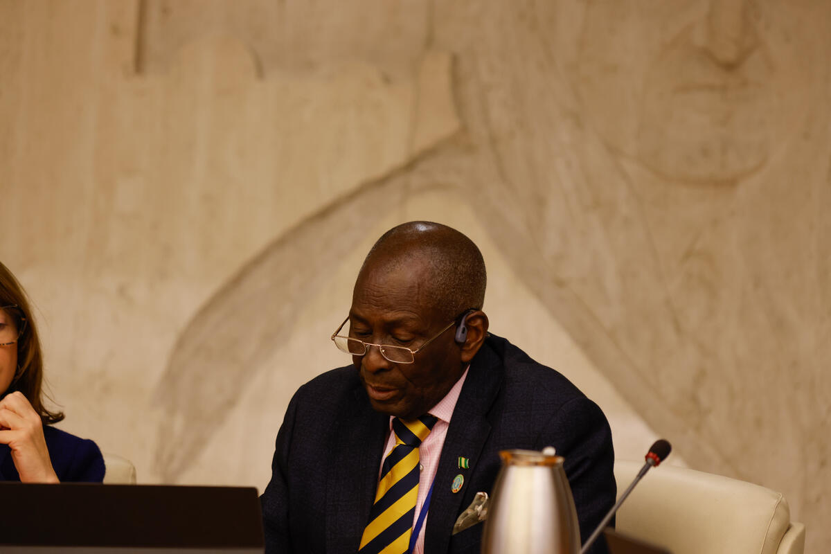15 October, 2025. FAO Headquarters, Rome, Italy. H.E. Yaya Adisa Olaitan Olaniran, Permanent Representative of Nigeria at Rome-based Food Agencies of the United Nations, intervenes at the 'Intersessional Event of the FAO Committee on Commodity Problems: Better information for better policies' during the 2025 World Food Forum.