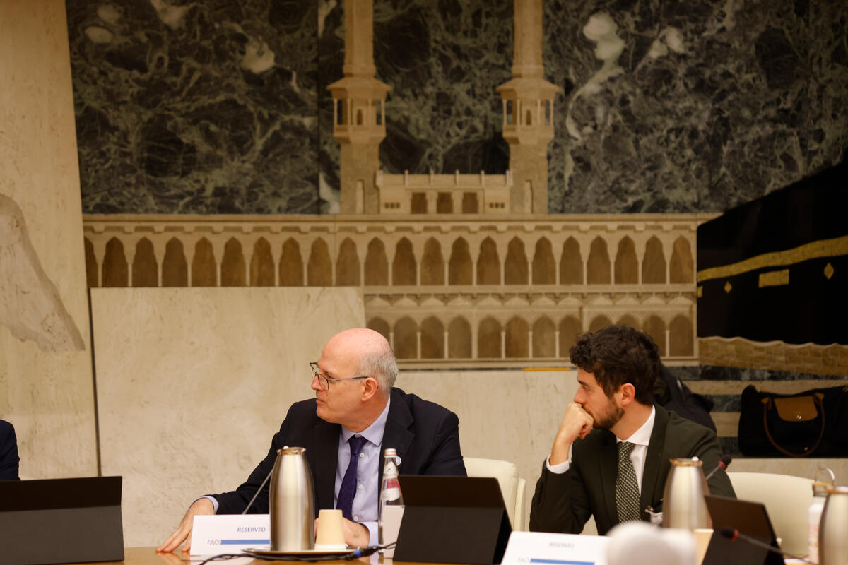 15 October, 2025. FAO Headquarters, Rome, Italy. Dr. Martial Bernoux (L), PhD and Senior Natural Resources Officer at the FAO, and Edoardo Corriere, Programme Coordinator at Young Professionals for Agricultural Development (YPARD), at the "YP07 - NAM Youth Perspective: Baku Harmoniya Climate Initiative for Farmers" during the 2025 World Food Forum, discussing the mobilization of finance and support for farmers on the frontlines of climate change.