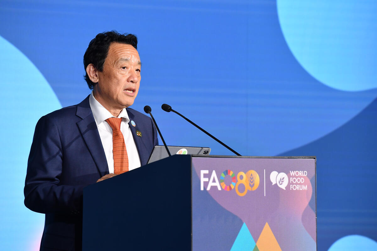 15 October 2025, Rome, Italy. FAO Director-General QU Dongyu delivers his opening remarks during the World Food Forum (WFF) 2025. The fifth edition of the World Food Forum (WFF), the largest annual gathering of agrifood systems stakeholders globally, runs at FAO headquarters in Rome from 10 to 17 October 2025. FAO Headquarters, (Plenary Hall).