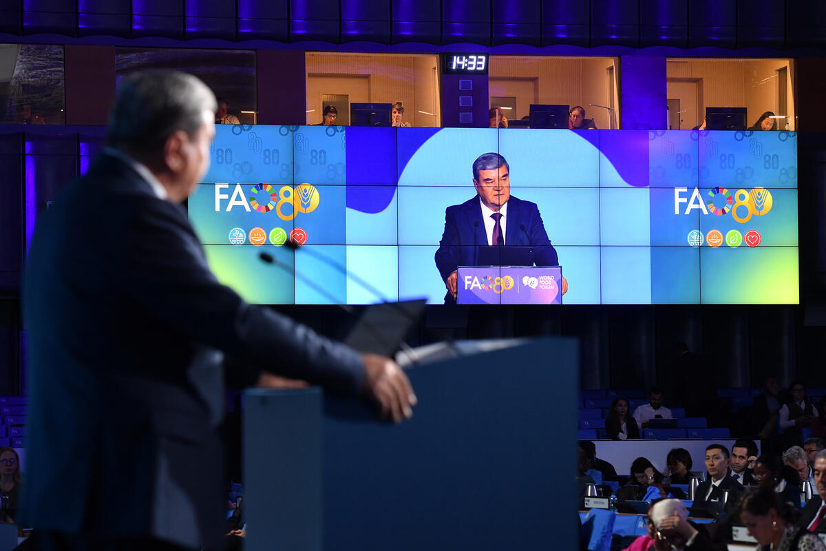 15 October 2025, Rome, Italy. Ziyozoda Sulaimon Rizoi, Deputy Prime Minister, Republic of Tajikistan delivers his address during the World Food Forum (WFF) 2025. The fifth edition of the World Food Forum (WFF), the largest annual gathering of agrifood systems stakeholders globally, runs at FAO headquarters in Rome from 10 to 17 October 2025. FAO Headquarters, (Plenary Hall)