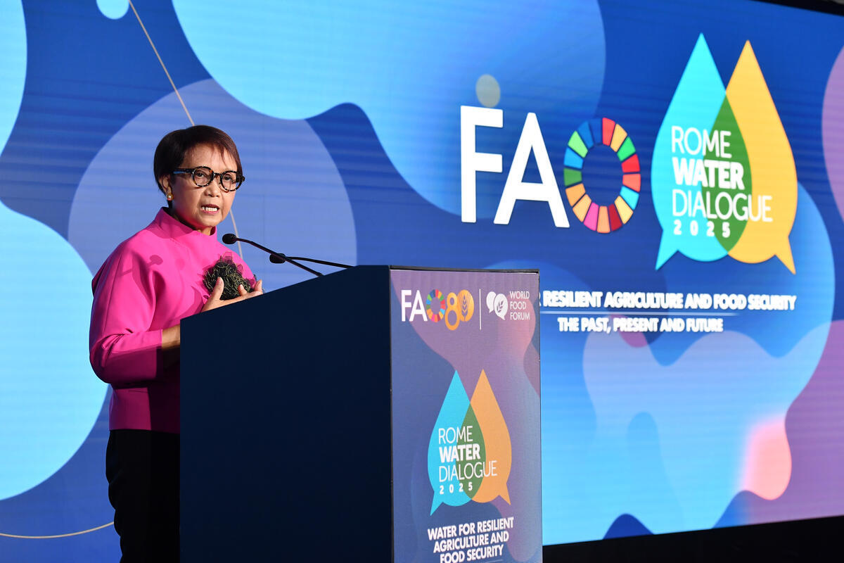 15 October 2025, Rome, Italy. Her Excellency Retno L.P. Marsudi, UN Secretary-General’s Special Envoy on Water speaks at the opening ceremony of the Rome Water Dialogue: High-Level Segment. The fifth edition of the World Food Forum (WFF), the largest annual gathering of agrifood systems stakeholders globally, runs at FAO headquarters in Rome from 10 to 17 October 2025. FAO Headquarters (Plenary Hall).
