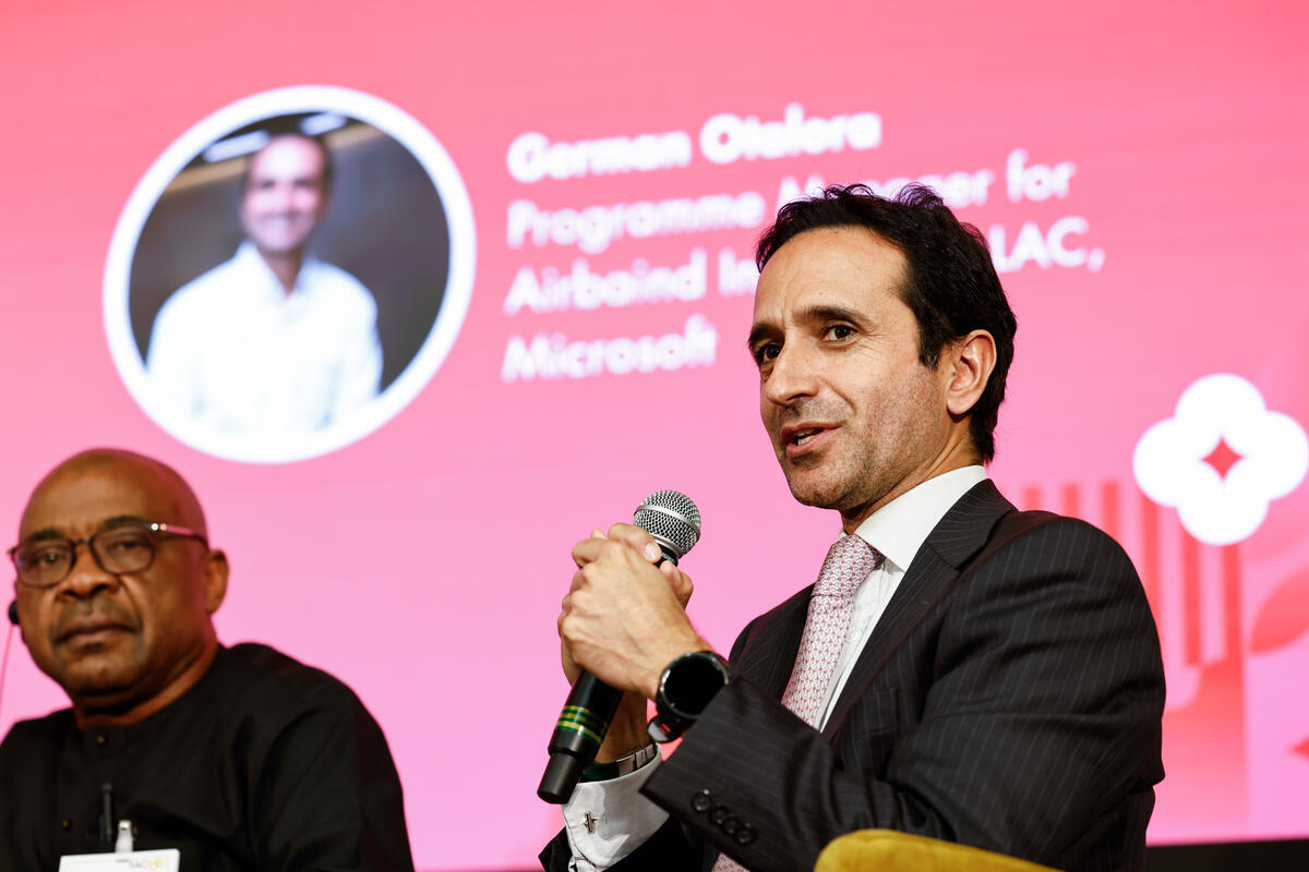 15 October 2025, Rome, Italy. Programme Manager for Airband Initiative in LAC - Microsoft German Otalora (R) attends thematic session: The business case for investing in women and youth in agrifood systems – Driving productivity and profitability. Hand-in-Hand (HIH) Initiative Investment Forum 2025. World Food Forum (WFF) 2025. The fifth edition of the World Food Forum (WFF), the largest annual gathering of agrifood systems stakeholders globally, runs at FAO headquarters in Rome from 10 to 17 October 2025. FAO Headquarters (Green Room).