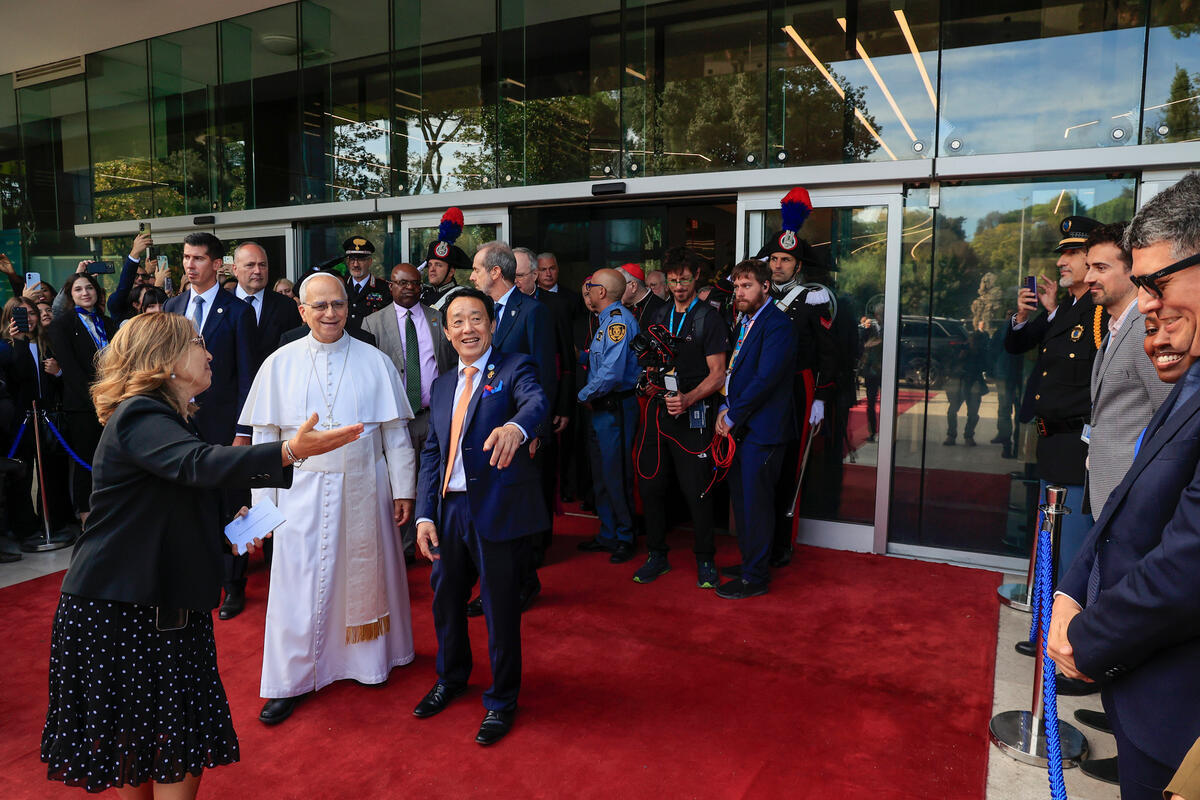 16 October 2025, Rome, Italy. His Holiness Pope Leo XIV, flanked by FAO Director-General QU Dongyu (C), greets FAO’s staff as he leaves after attending the WFD ceremony. World Food Day Celebrations. This year’s World Food Day coincides with FAO’s 80th anniversary, reflecting decades of work to boost food production, reduce poverty, and respond to crises. FAO Headquarters.