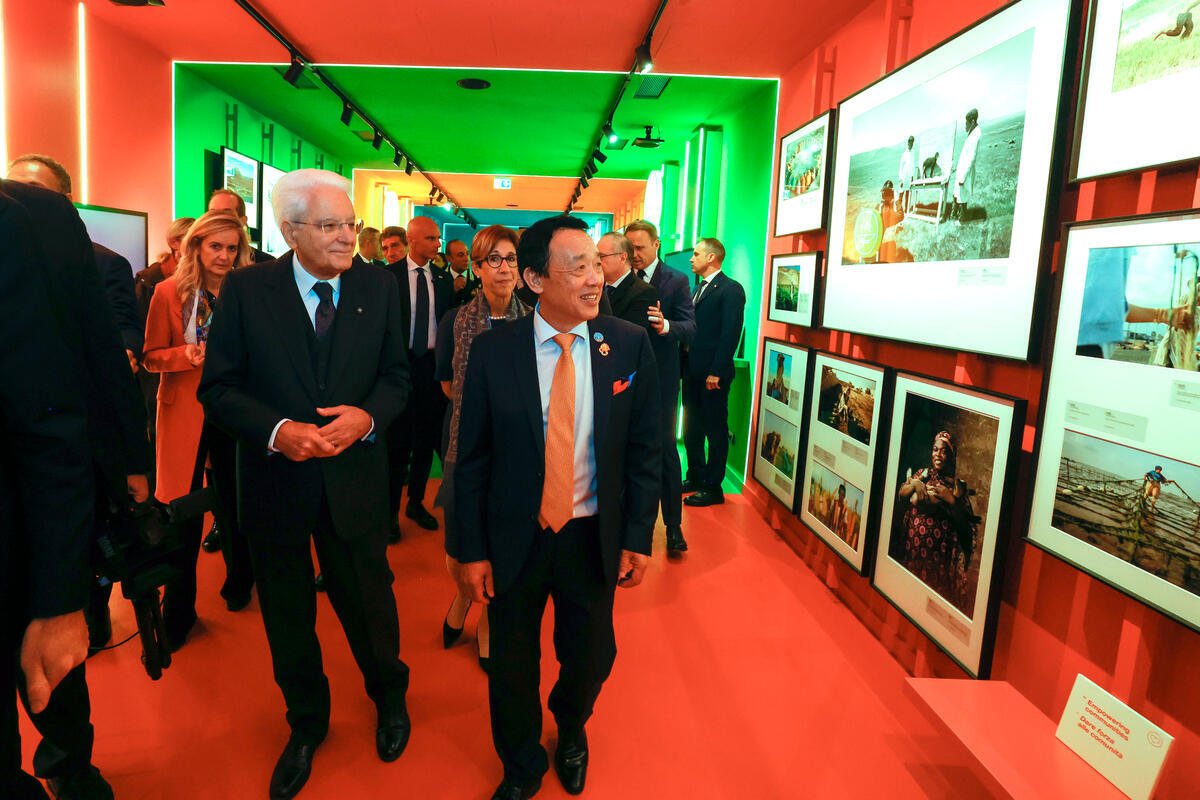 16 October 2025, Rome, Italy. The President of the Italian Republic, Sergio Mattarella and FAO Director-General QU Dongyu (R) visit the Food and Agriculture Museum & Network (FAO MuNe). FAO World Food Day Global ceremony and 80th Anniversary celebration. This year’s World Food Day coincides with FAO’s 80th anniversary, reflecting decades of work to boost food production, reduce poverty, and respond to crises. FAO Headquarters (Plenary Hall).