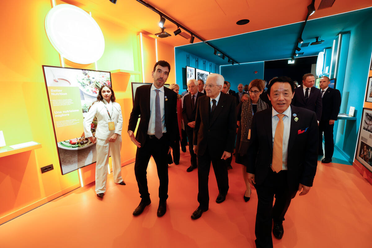 6 October 2025, Rome, Italy. President of the Italian Republic, Sergio Mattarella (C) is escorted by FAO Director-General QU Dongyu (R) and Maurizio Martina, FAO Deputy Director-General, during his visit to the Food and Agriculture Museum & Network (FAO MuNe). FAO World Food Day Global ceremony and 80th Anniversary celebration. This year’s World Food Day coincides with FAO’s 80th anniversary, reflecting decades of work to boost food production, reduce poverty, and respond to crises. FAO Headquarters.
