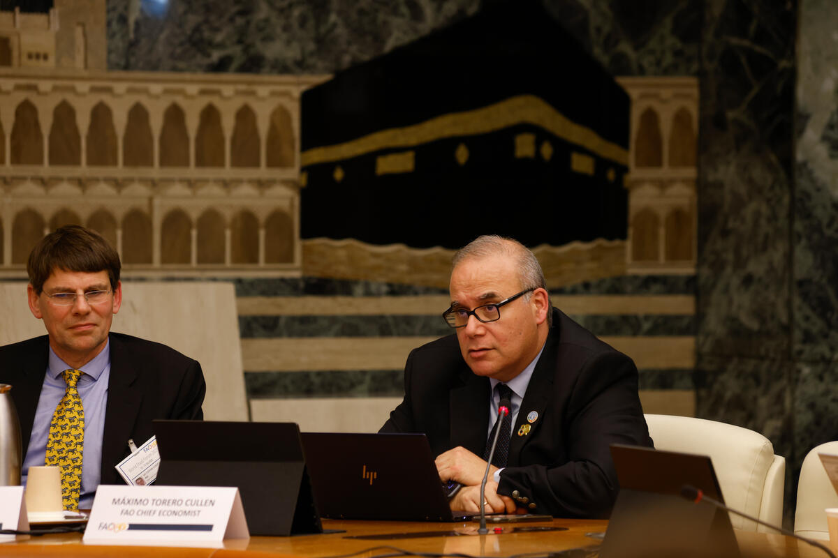 15 October, 2025. FAO Headquarters, Rome, Italy. Máximo Torero (L), FAO Chief Economist, speaks at the 'Intersessional Event of the FAO Committee on Commodity Problems: Better information for better policies' event during the 2025 World Food Forum. Hubertus Gay (L), Head of the Agro-Food Trade and Market Division in the Trade and Agriculture Directorate at OECD, sits beside him.
