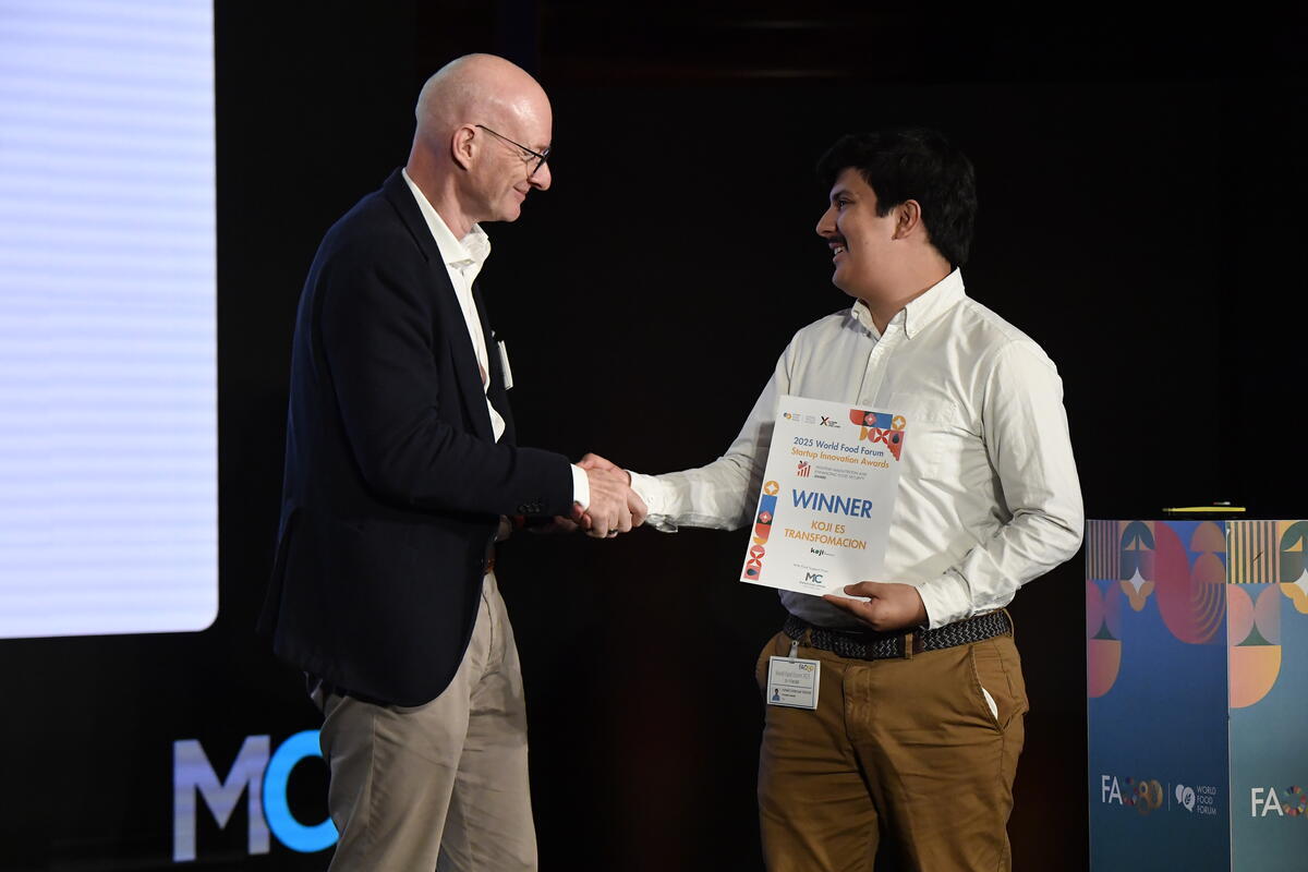 15 October 2025. FAO Headquarters, Rome, Italy. Juan Sebastián Rubiano Chona, Co-founder of Koji es Transformación (R) is awarded the Fighting malnutrition and enhancing food security prize by MassChallenge Switzerland during the World Food Forum Startup Innovation Award. World Food Forum (WFF) 2025. The fifth edition of the World Food Forum (WFF), the largest annual gathering of agrifood systems stakeholders globally, runs at FAO headquarters in Rome from 10 to 17 October 2025. FAO Headquarters (SZC - Sheikh Zayed International Media and Knowledge Centre).