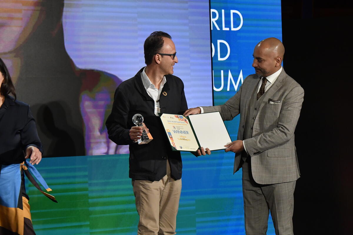 15 October 2025. FAO Headquarters, Rome, Italy. Mauricio Herrera, CEO and Co-Founder of Lilliput Technologies Limited (L) is awarded the Enhancing Climate Resilience and Water Security Award during the World Food Forum Startup Innovation Award. World Food Forum (WFF) 2025. The fifth edition of the World Food Forum (WFF), the largest annual gathering of agrifood systems stakeholders globally, runs at FAO headquarters in Rome from 10 to 17 October 2025. FAO Headquarters (SZC - Sheikh Zayed International Media and Knowledge Centre).