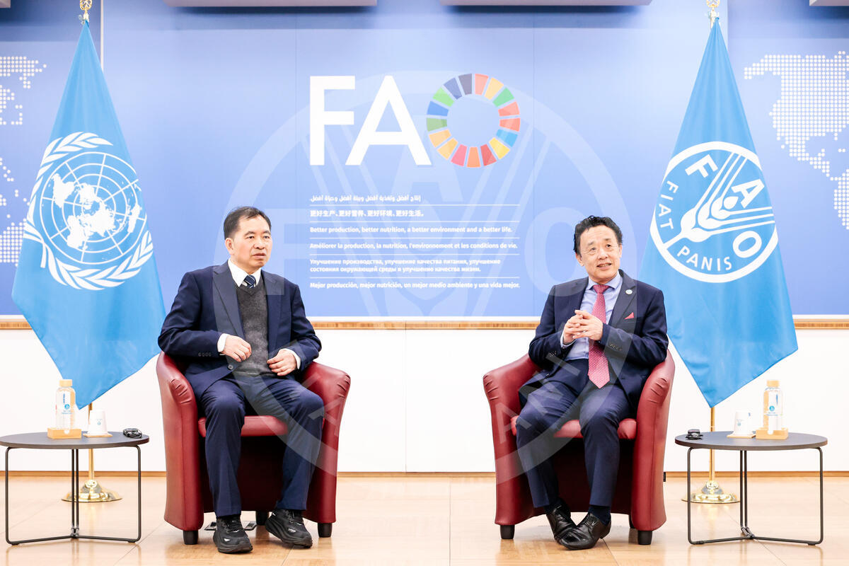 10 March 2025. Rome, Italy. FAO Director-General QU Dongyu (R) meets ZOU Xuexiao, President of Hunan Agricultural University (HAU). FAO headquarters, (Iraq room).
