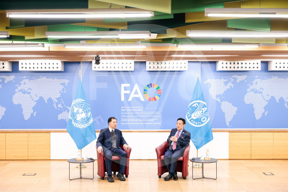 10 March 2025. Rome, Italy. FAO Director-General QU Dongyu (R) meets ZOU Xuexiao, President of Hunan Agricultural University (HAU). FAO headquarters, (Iraq room).