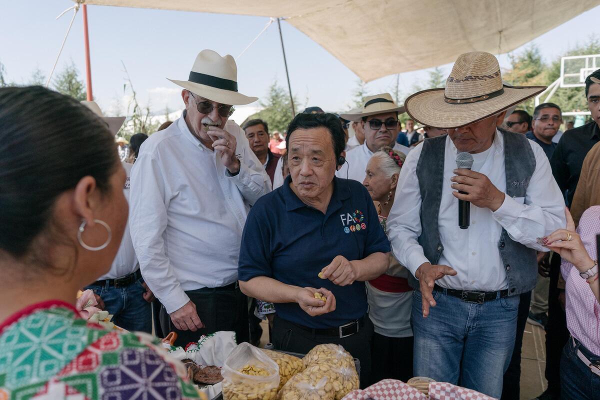 26 October 2025. Españita, Tlaxcala, State, Mexico. FAO Director-General QU Dongyu during a tasting at the Globally Important Agricultural Heritage System (GIAHS) "Metepantle" in Españita, Tlaxcala, State, Mexico..
