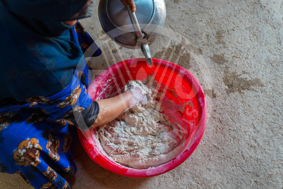 Tahera is skillfully preparing dough with wheat flour, measuring the ingredients to ensure the perfect consistency for her bread.