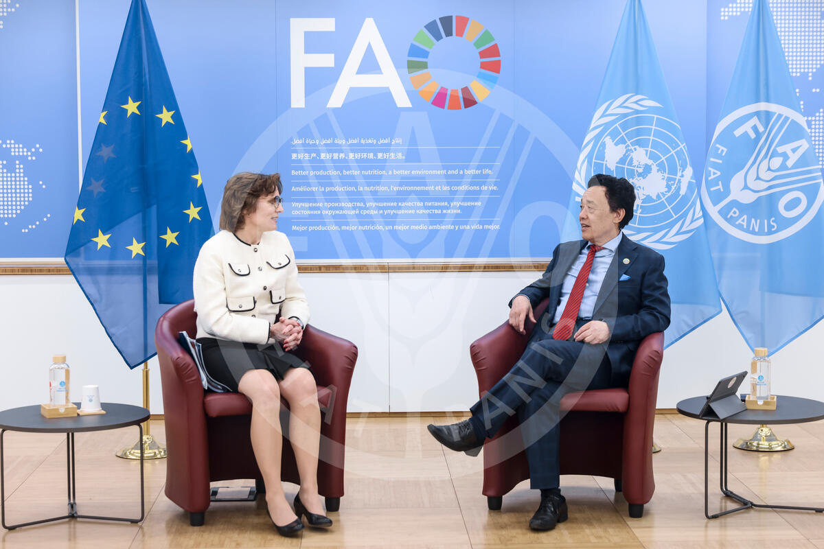 21 March 2025 Rome, Italy. FAO Director-General QU Dongyu (R) meets with Jessika Roswall, EU Commissioner Environment, Water Resilience, Competitive Circular Economy (L). FAO Headquarters (Iraq Room)