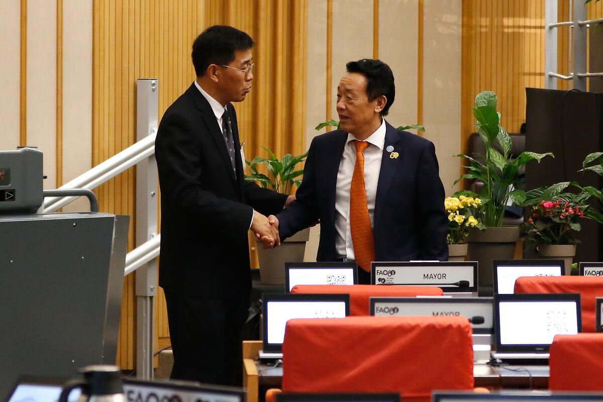 FAO's Director General Qu Dongyu (R) shakes hands with Liu Bing (L), Director General Three North Program Administration of National Forest and Grassland Administration China, during the First International Green Cities Conference.
