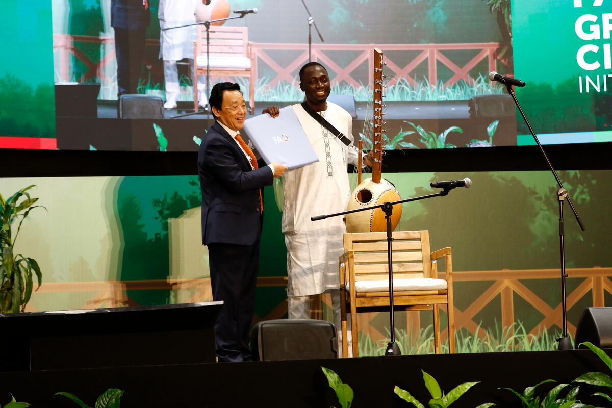FAO's Director General Qu Dongyu (L) on stage during the First International Green Cities Conference together with Yaya Sonko (R), a kora player who blends traditional Afro-mande melodies with contemporary music influences.