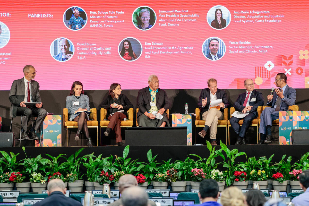 15 October 2025. FAO Headquarters, Rome, Italy. Panelists participate in the thematic session “Investing in Resilience to Climate Variability and Extremes” at the Hand-in-Hand (HIH) Initiative Investment Forum 2025, held during the World Food Forum 2025. From left to right: Mohamed Manssouri, Director of the FAO Investment Centre and session moderator; Lina Salazar, Lead Economist in the Agriculture and Rural Development Division at the Inter-American Development Bank (IDB); Ana Maria Loboguerrero, Director of Adaptive and Equitable Food Systems at the Bill & Melinda Gates Foundation; Hon. Sa’aga Talu Teafa, Minister of Natural Resources Development of Tuvalu; Emmanuel Marchant, Vice President for Sustainability in Africa and General Manager of the Ecosystem Fund at Danone; David Brussa, Director of Quality and Sustainability at illycaffè S.p.A.; and Yasser Ibrahim, Sector Manager for Environment, Social and Climate at the Multilateral Investment Guarantee Agency (MIGA).