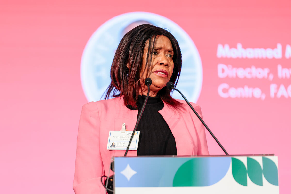 15 October 2025. FAO Headquarters, Rome, Italy. Diane Sibanda, President of the Botswana Farmers Association (BOFA) and Chairperson of the Eastern and Southern Africa Small-Scale Farmers Forum (ESAFF), speaks during the thematic session “Investing in Resilience to Climate Variability and Extremes” at the Hand-in-Hand (HIH) Initiative Investment Forum 2025, held during the World Food Forum 2025.