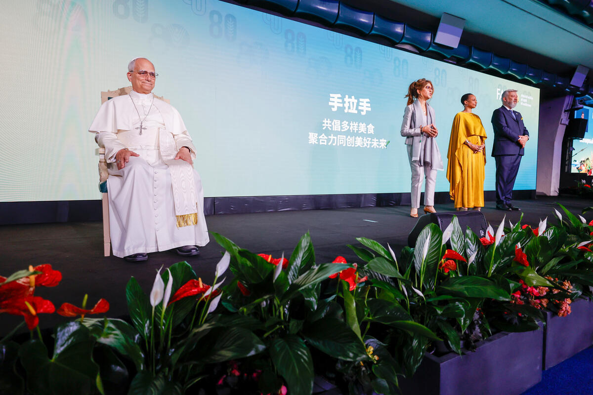 16 October 2025, Rome, Italy. His Holiness Pope Leo XIV (L) looks on during the World Food Day Global ceremony and 80th Anniversary celebration. This year’s World Food Day coincides with FAO’s 80th anniversary, reflecting decades of work to boost food production, reduce poverty, and respond to crises. FAO Headquarters (Plenary Hall)