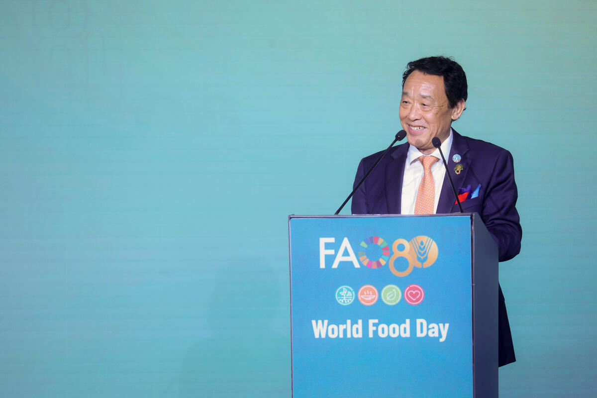 16 October 2025, Rome, Italy. FAO Director-General QU Dongyu delivers his opening remarks during the World Food Day Global ceremony and 80th Anniversary celebration. This year’s World Food Day coincides with FAO’s 80th anniversary, reflecting decades of work to boost food production, reduce poverty, and respond to crises. FAO Headquarters (Plenary Hall)