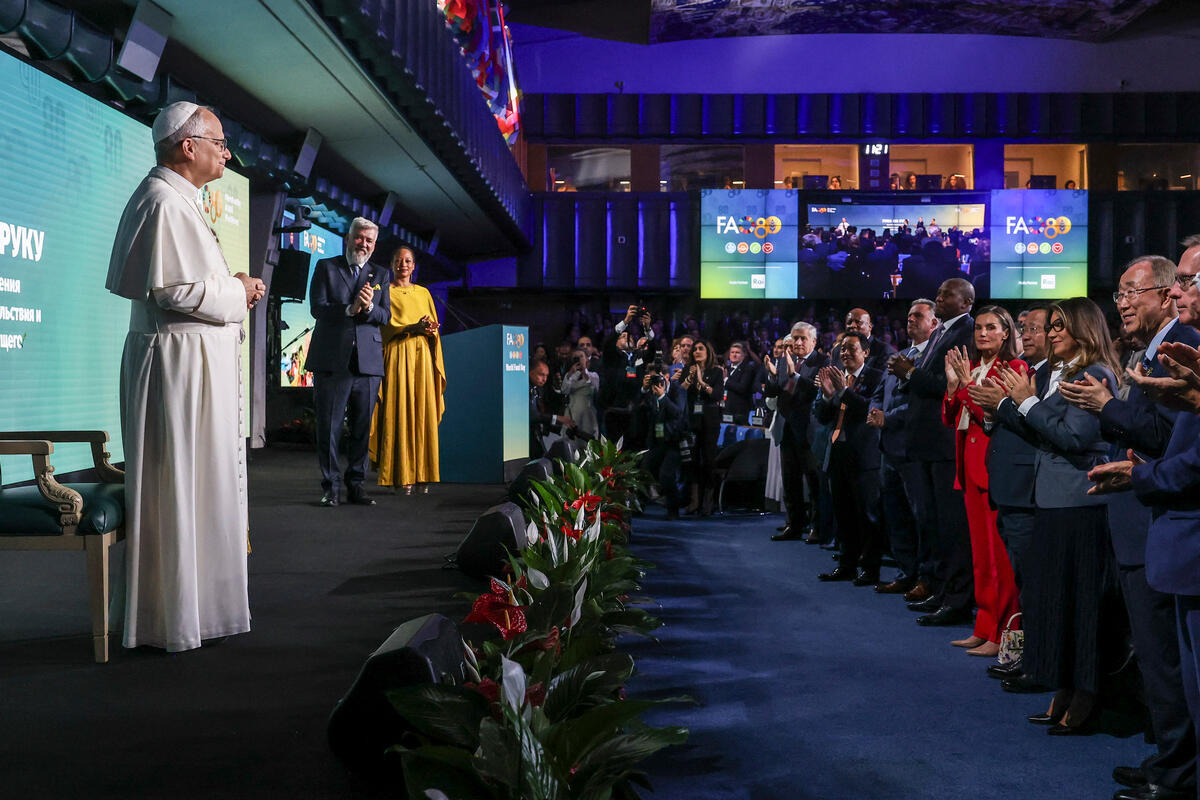 16 October 2025. Plenary Hall, FAO Headquarters, Rome, Italy. His Holiness Pope Leo XVI delivers his remarks during the World Food Day Global ceremony and 80th Anniversary celebration.