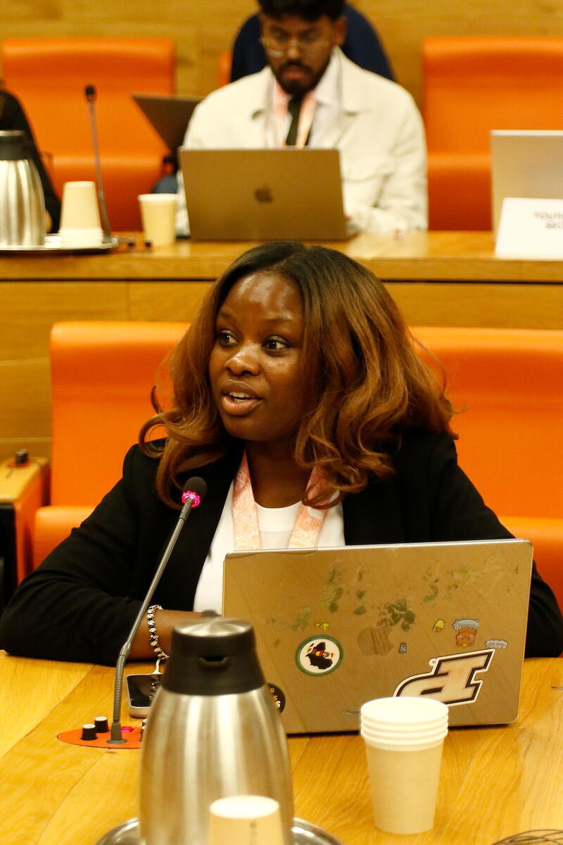 16 October 2025, FAO Rome Headquarters, Italy. WFF Youth Policy Board member Feyisayo Akande intervenes at the Youth Assembly Session: The 2nd UN Food Systems Summit Stocktake follow up.