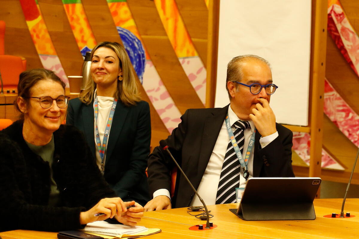 16 October 2025, FAO Rome Headquarters, Italy. Anja Wagner (L), Nicole De Paula (C) and Stefanos Fotiou (R) attend the Youth Assembly Session: The 2nd UN Food Systems Summit Stocktake follow up.