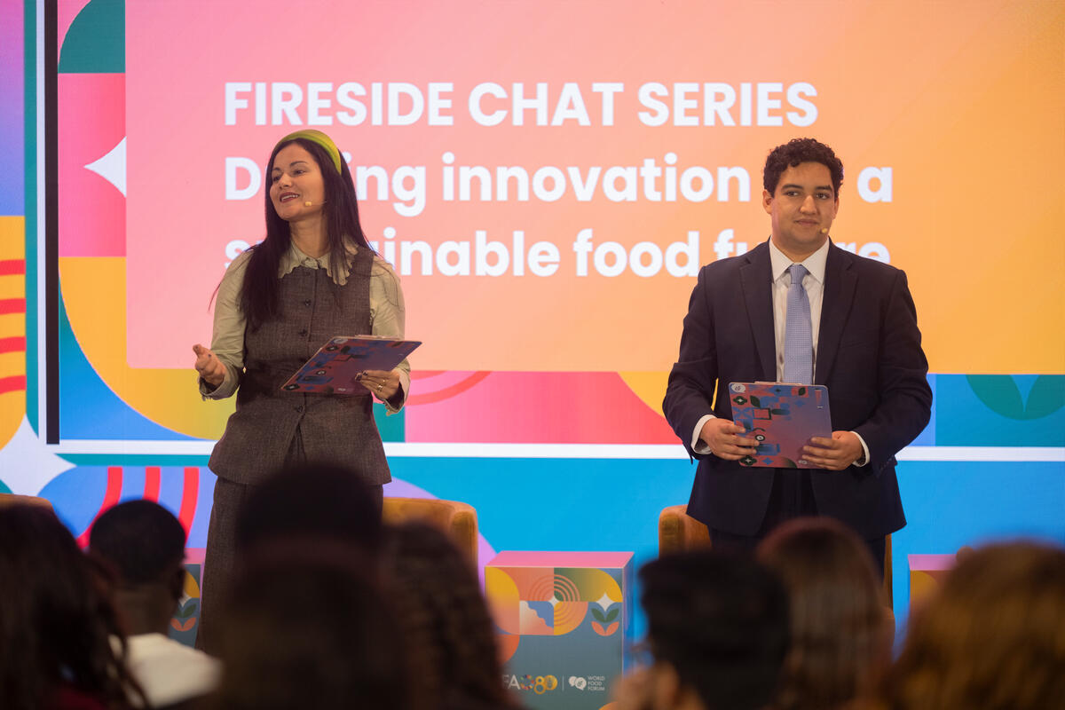 16 October 2025. FAO Headquarters, Rome, Italy. Mr. Oscar Lopez (L), 13th United States Youth Observer to the United Nations, and Ms. Barbara Della Rovere (R), Engagement and Outreach Coordinator, Office of Innovation, FAO, moderate the session “Talk to Your Laureates” during the World Food Forum (WFF) 2025.