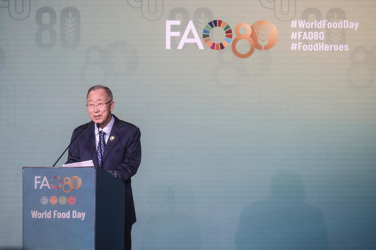 16 October 2025, Rome, Italy. Former Secretary-General of the United Nations Ban Ki-moon speaks during the World Food Day Global ceremony and 80th Anniversary celebration. This year’s World Food Day coincides with FAO’s 80th anniversary, reflecting decades of work to boost food production, reduce poverty, and respond to crises. FAO Headquarters (Plenary Hall)