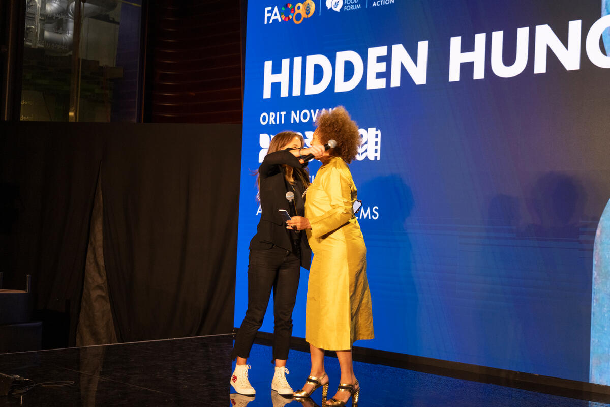 15 October 2025. FAO Headquarters, Rome, Italy. Filmmaker Orit Novak (L) wins the “Best Focus on Women in Agrifood Systems” category at the World Food Forum Youth Film Festival for her “Hidden Hunger” film. Together with her on the stage, Iris Peynado (R), actress and member of the panel of judges for the category.
