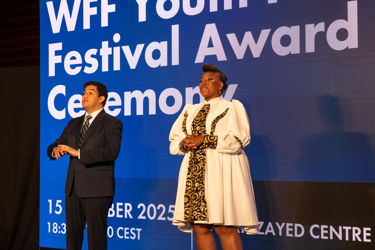 15 October 2025. FAO Headquarters, Rome, Italy. Oscar Lopez (L), 13th United States Youth Observer to the United Nations, and Dr. Rachel V. Brown (R), Executive Director & Co-founder of the Every Mikkle Foundation and WFF Champion, present at the “World Food Forum Youth Film Festival Award Ceremony” at the 2025 World Food Forum.