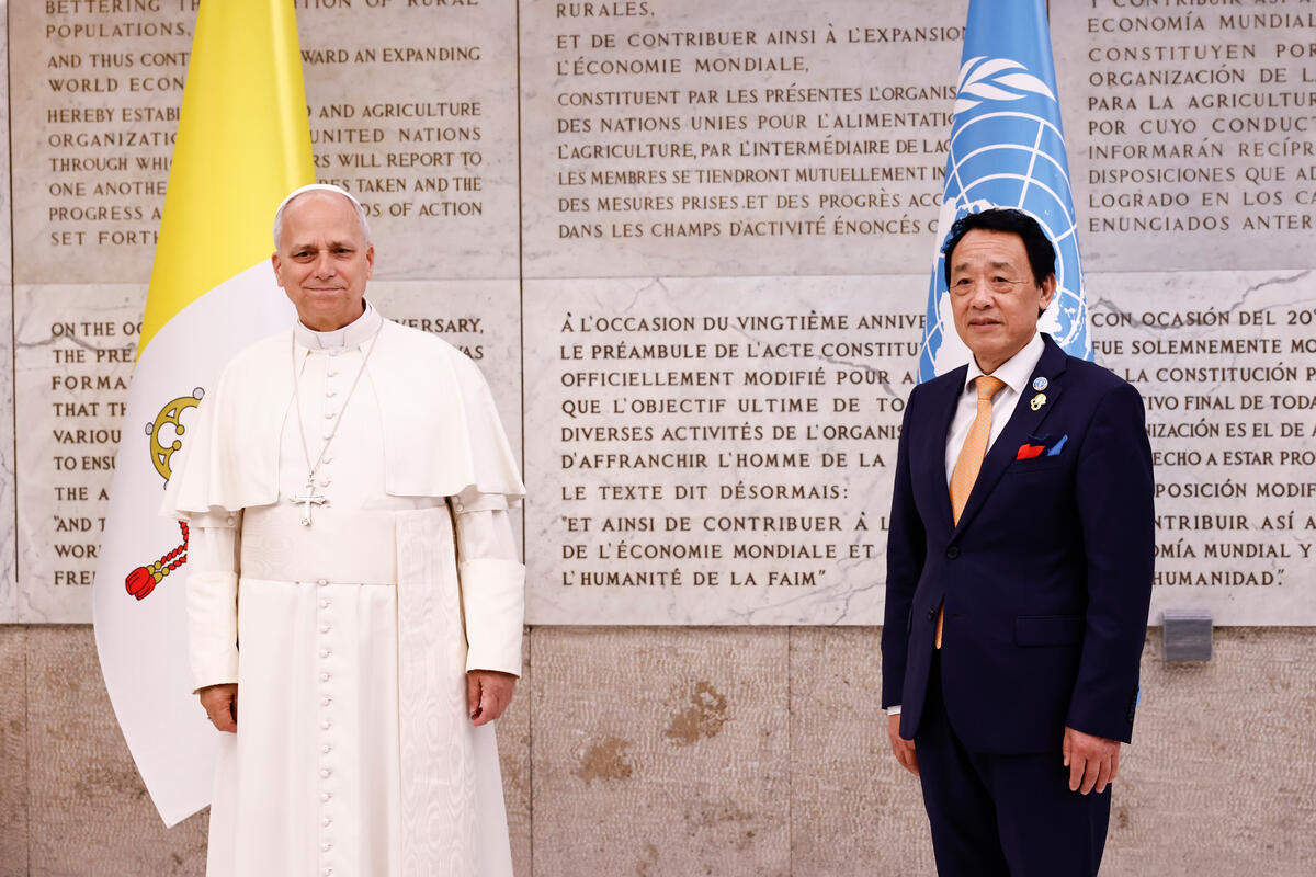 16 October 2025, Rome, Italy. FAO Director-General QU Dongyu welcomes His Holiness Pope Leo XIV. World Food Day Global ceremony and 80th Anniversary celebration. This year’s World Food Day coincides with FAO’s 80th anniversary, reflecting decades of work to boost food production, reduce poverty, and respond to crises. FAO Headquarters.