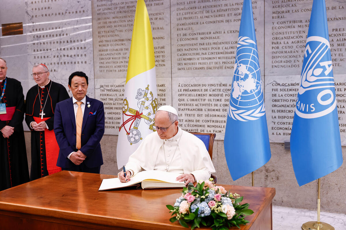 16 October 2025, Rome, Italy. FAO Director-General QU Dongyu looks at His Holiness Pope Leo XIV signing the Golden Book of FAO at the FAO Constitution at the end of their meeting. World Food Day Global ceremony and 80th Anniversary celebration. This year’s World Food Day coincides with FAO’s 80th anniversary, reflecting decades of work to boost food production, reduce poverty, and respond to crises. FAO Headquarters.