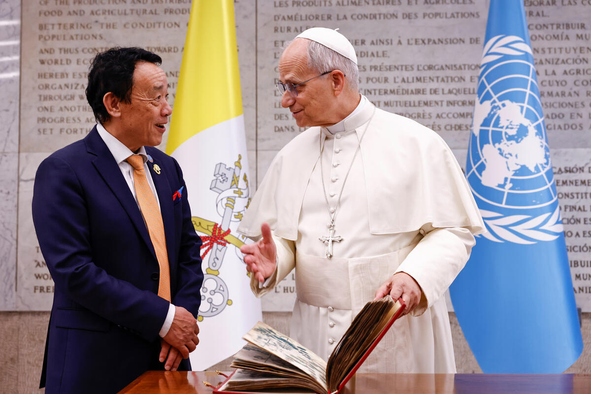 16 October 2025, Rome, Italy. Exchange of gifts between FAO Director-General QU Dongyu and His Holiness Pope Leo XIV at the FAO Constitution at the end of their meeting. World Food Day Global ceremony and 80th Anniversary celebration. This year’s World Food Day coincides with FAO’s 80th anniversary, reflecting decades of work to boost food production, reduce poverty, and respond to crises. FAO Headquarters.