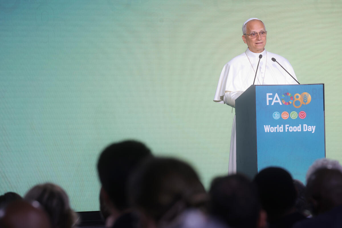 16 October 2025. Plenary Hall, FAO Headquarters, Rome, Italy. His Holiness Pope Leo XVI delivers his remarks during the World Food Day Global ceremony and 80th Anniversary celebration.