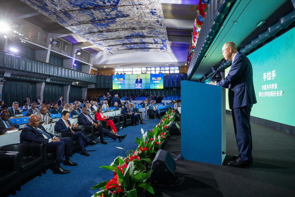 16 October 2025, Rome, Italy. Ban Ki-moon, Chair of the Board of the Boao Forum for Asia; and 8th Secretary-General of the UN delivers his statement during the World Food Day Global ceremony and 80th Anniversary celebration. This year’s World Food Day coincides with FAO’s 80th anniversary, reflecting decades of work to boost food production, reduce poverty, and respond to crises. FAO Headquarters (Plenary Hall)