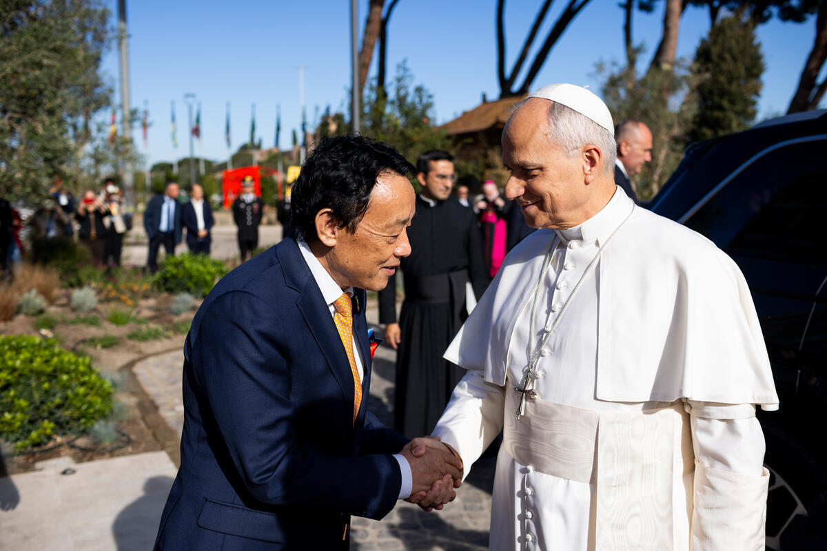 16 October 2025, Rome, Italy. FAO Director-General QU Dongyu welcomes His Holiness Pope Leo XIV. World Food Day Global ceremony and 80th Anniversary celebration. This year’s World Food Day coincides with FAO’s 80th anniversary, reflecting decades of work to boost food production, reduce poverty, and respond to crises. FAO Headquarters.