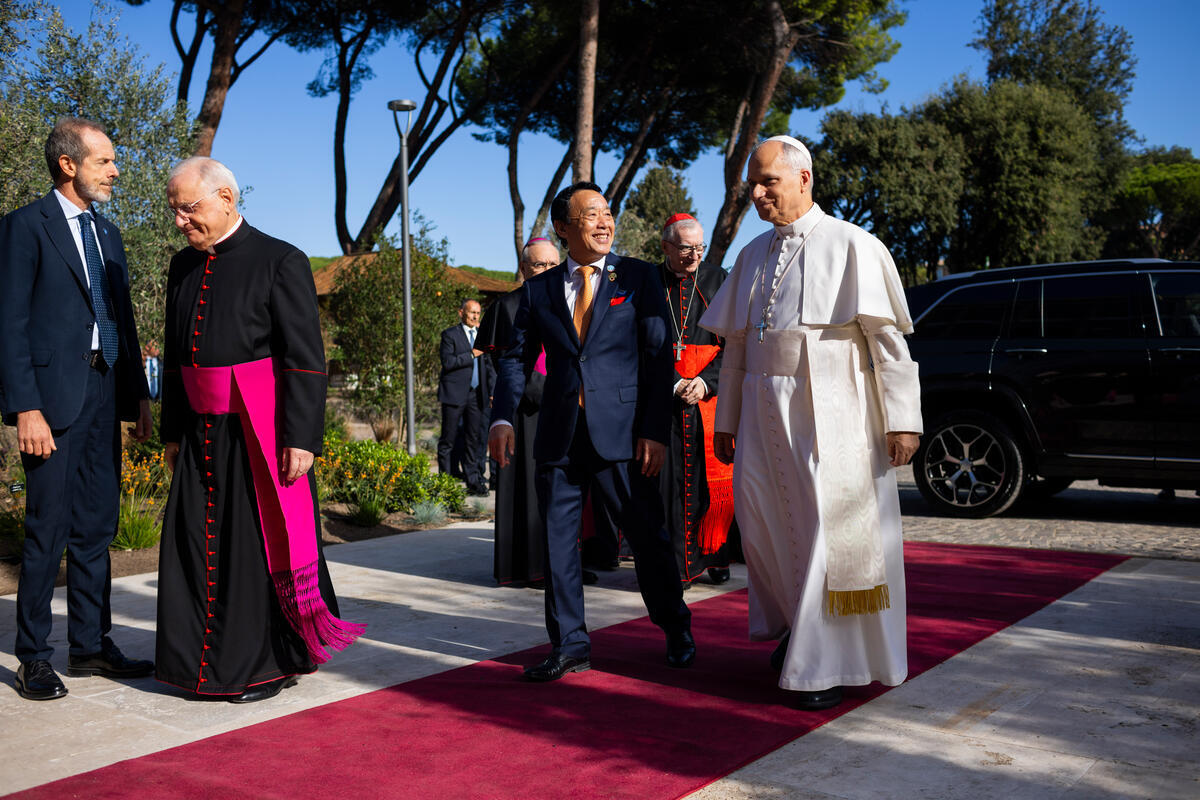 16 October 2025, Rome, Italy.  FAO Director-General QU Dongyu welcomes His Holiness Pope Leo XIV. World Food Day Global ceremony and 80th Anniversary celebration. This year’s World Food Day coincides with FAO’s 80th anniversary, reflecting decades of work to boost food production, reduce poverty, and respond to crises. FAO Headquarters.