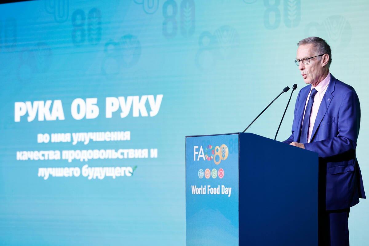16 October 2025, Rome, Italy. Donal Brown, Associate Vice-President, Department of Development Cooperation, IFAD delivers his statement during the World Food Day Global ceremony and 80th Anniversary celebration. This year’s World Food Day coincides with FAO’s 80th anniversary, reflecting decades of work to boost food production, reduce poverty, and respond to crises. FAO Headquarters (Plenary Hall)