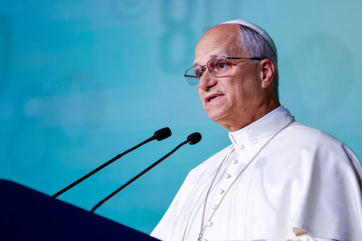 16 October 2025, Rome, Italy. His Holiness Pope Leo XIV delivers his remarks during the World Food Day Global ceremony and 80th Anniversary celebration. This year’s World Food Day coincides with FAO’s 80th anniversary, reflecting decades of work to boost food production, reduce poverty, and respond to crises. FAO Headquarters (Plenary Hall)