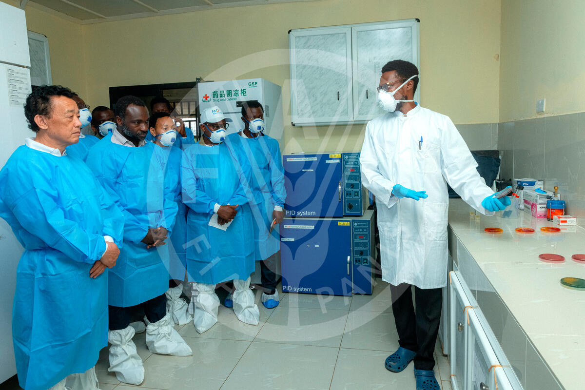20 July 2025. Makeni, Sierra Leone. Microbiologist Ishmael Nyakeh Sombie of the Central Veterinary Laboratory, Teko, Makeni, Northern Sierra Leone shows some culture samples to FAO Director-General QU Dongyu and Minister of Agriculture Dr. Henry Musa Kpaka.