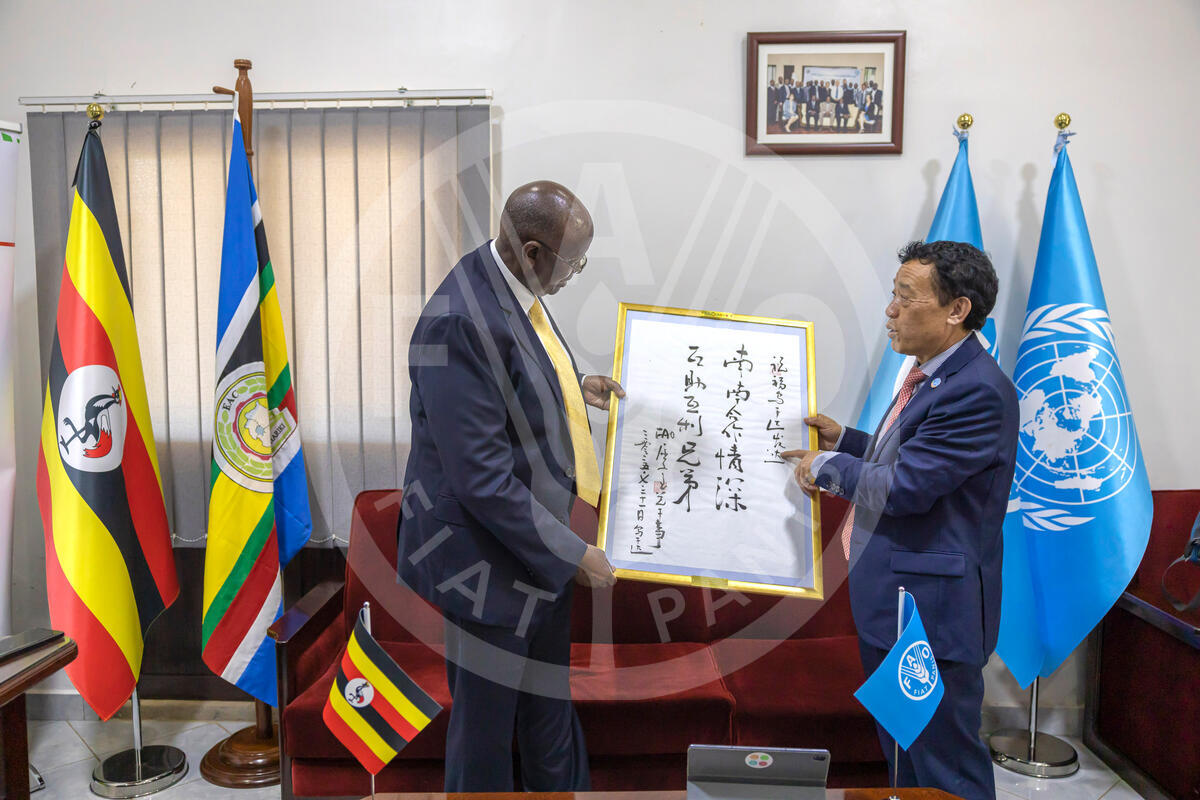21 July 2025, Entebbe, Uganda. FAO Director-General, QU Dongyu presents his calligraphy as a gift to Hon. Bright Rwamirama, State Minister for Animal Industry, during his visit to the Ministry of Agriculture, Animal Industry and Fisheries.