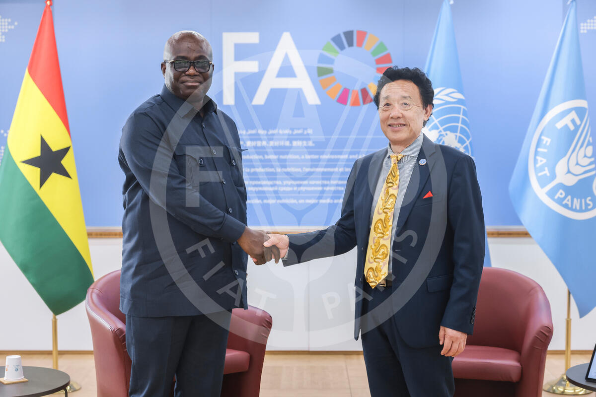 28 June 2025, Rome, Italy. FAO Director-General QU Dongyu meets with Ghana Minister for Food and Agriculture Eric Opoku. (Iraq Room) FAO Headquarters.