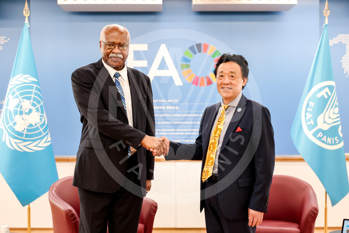 28 June 2025. Rome, Italy. FAO Director-General QU Dongyu (R) meets Philemon Yang, President of the United Nations General Assembly. FAO headquarters (Iraq room).