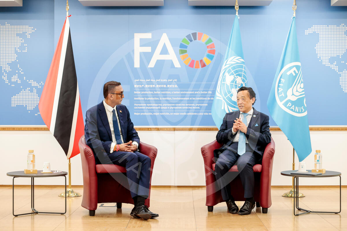 29 June 2025. Rome, Italy. FAO Director-General QU Dongyu meets Trinidad and Tobago Minister for Agriculture, Land and Fisheries Agriculture, Ravi Ratiram. FAO headquarters (Iraq room).
