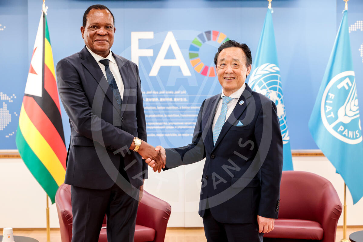 29 June 2025. Rome, Italy. FAO Director-General QU Dongyu meets Zimbabwe Minister for Lands, Agriculture, Fisheries, Water and Rural Development, Anxious Jongwe. FAO headquarters (Iraq room).