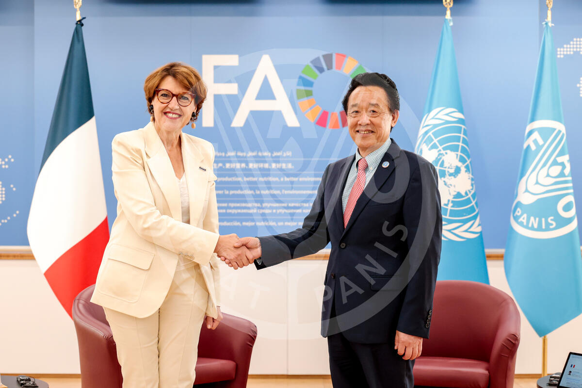 27 June 2025. Rome, Italy. FAO Director-General QU Dongyu (R) meets France Minister for Agriculture, Annie Genevard. FAO headquarters (Iraq room).