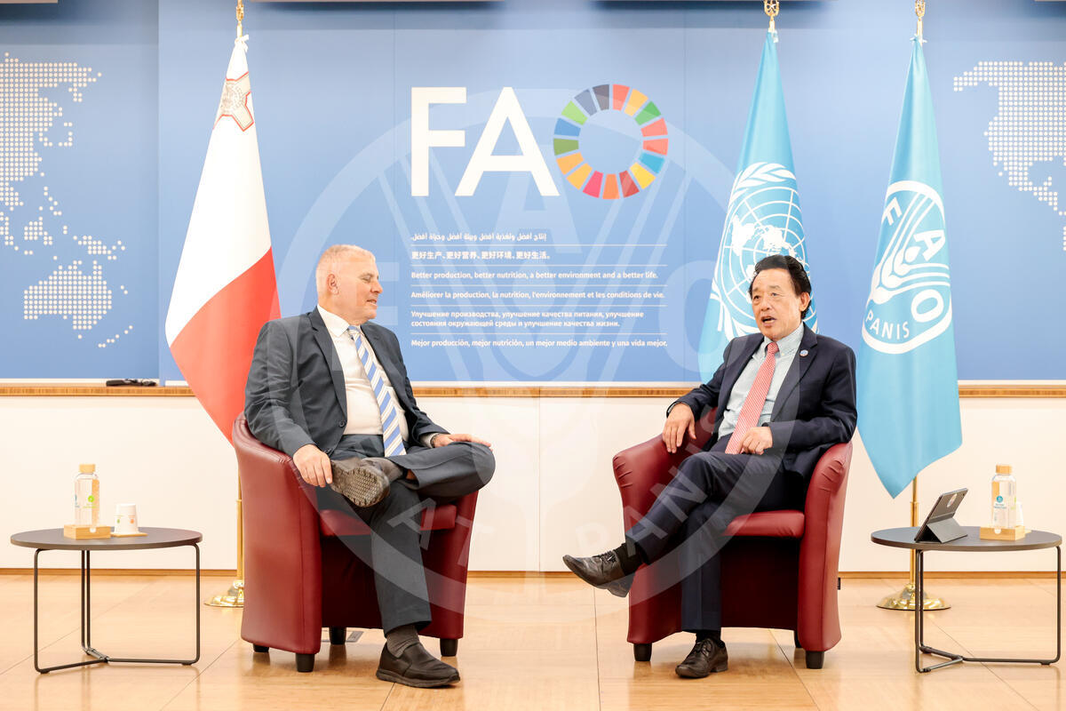 27 June 2025. Rome, Italy. FAO Director-General QU Dongyu (R) meets Malta Minister for Agriculture, Fisheries and Animal Rights, Anton Refalo. FAO headquarters (Iraq room).